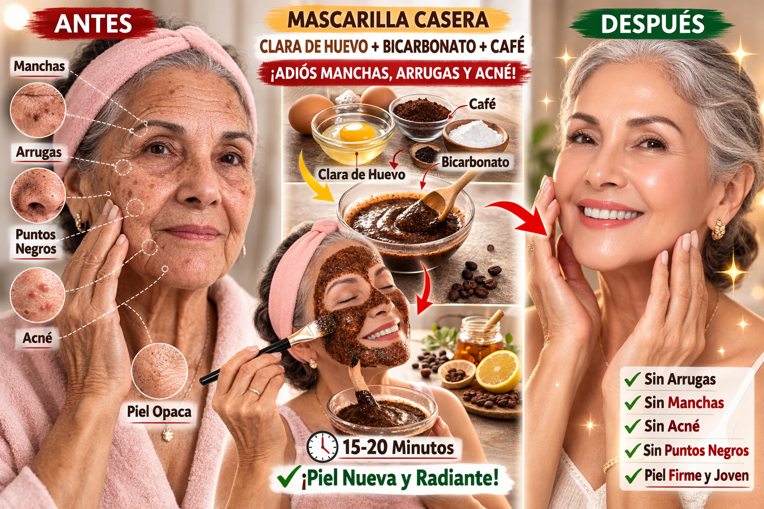 Una combinación muy popular en el cuidado facial casero es la clara de huevo, el bicarbonato de sodio y el café, tres ingredientes que ayudan a combatir manchas, arrugas, puntos negros y acné, además de aportar luminosidad al rostro. Esta mascarilla natural también puede ayudar a mejorar la textura de la piel y darle un aspecto más firme y rejuvenecido.